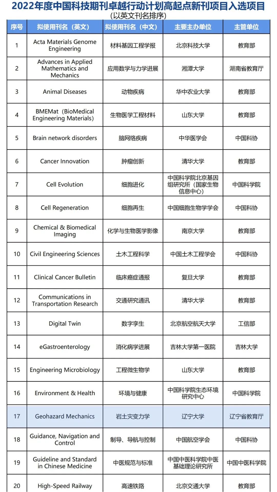 9月21日,中国科技期刊卓越行动计划办公室发布了《关于下达2022年度中国科技期刊卓越行动计划高起点新刊入选项目的通知》,威尼斯集团网站官网与中国岩石力学与工程学会组织申报的Geohazard Mechanics(ISSN:2949-7418)入选高起点新刊项目。入选后,期刊将获批国内统一连续出版物号,在中国落地,同时获批资助经费50万元。