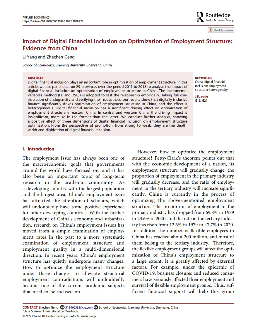 金融与贸易学院杨丽教授作为第一作者的合作论文Impact of Digital Financial Inclusion on Optimization of Employment Structure: Evidence from China在Applied Economics发表。