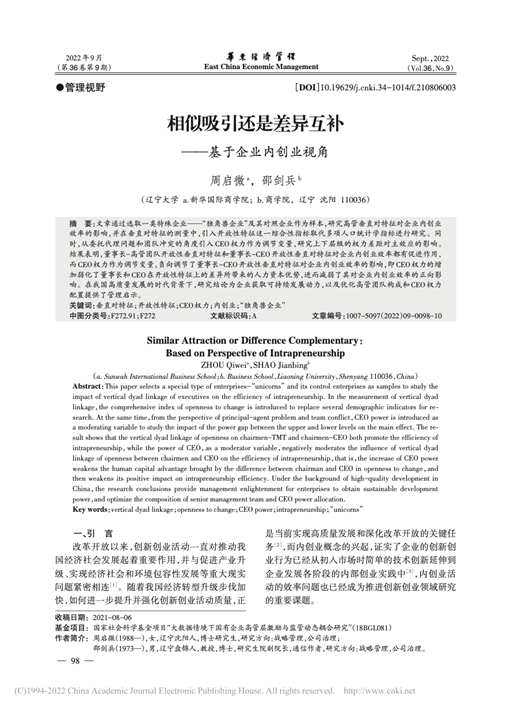 新华国际商学院教师周启微(第一作者)和商学院教授邵剑兵(通讯作者)合作撰写的学术论文“相似吸引还是差异互补——基于企业内创业视角”在《华东经济管理》2022年第9期发表。
