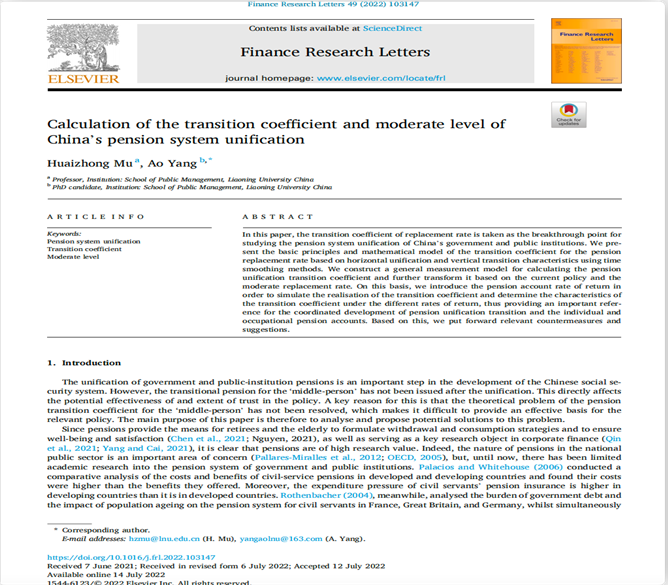 威尼斯集团网站官网公共管理学院穆怀中教授与博士生杨傲合作撰写的学术论文“Calculation of the transition coefficient and moderate level of China’s pension system unification”,在国际期刊Finance Research Letters发表。