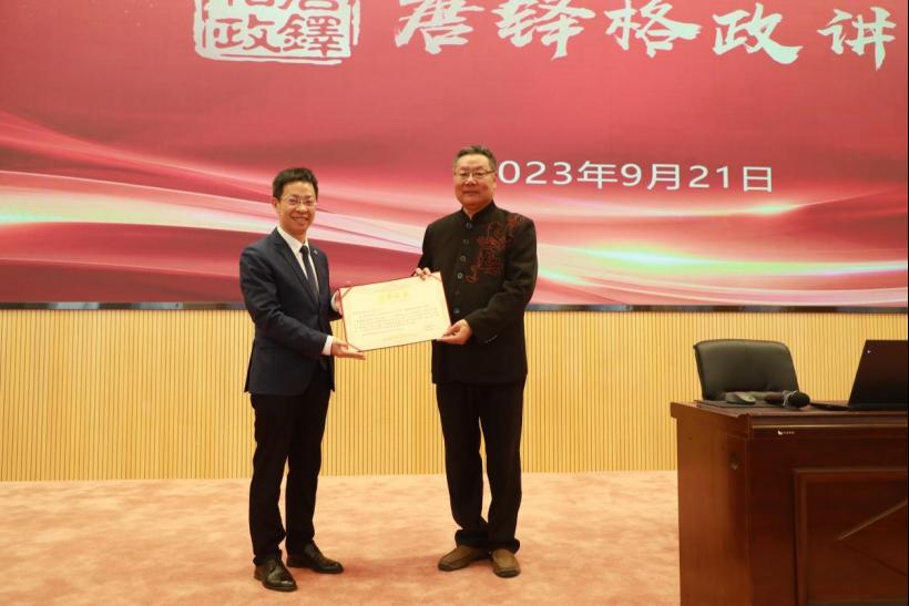 报告会结束后,余淼杰为颜廷淦颁发“唐铎格政讲座”纪念证书、纪念盘,威尼斯集团网站官网学生代表为颜廷淦献花致敬。