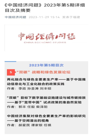 经济学院李政教授与硕士研究生孙圣涛、博士研究生刘丰硕合作在《中国经济问题》2023年第5期发表文章,题为《两化融合与绿色全要素生产率——基于中国推动信息化与工业化融合的政策实践》。